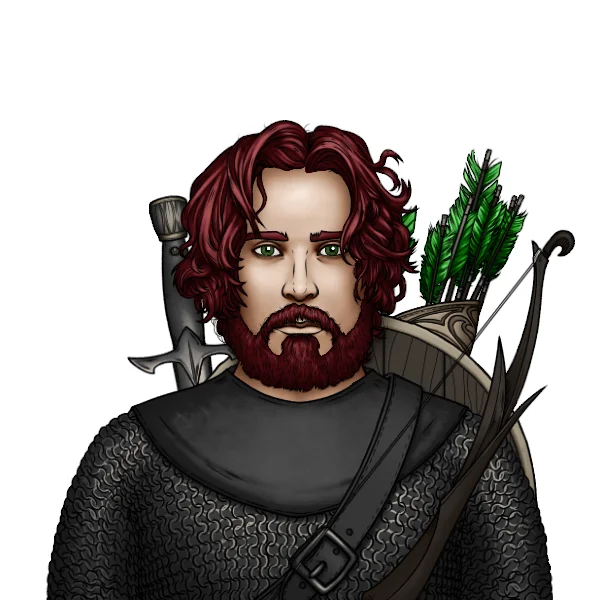 Bern is currently a 4th level ranger. He wields the Azure Serpent Blade, which has two brother blades he seeks, paired with a bent and twisted shield of orcish design. It is reputed to preserve a corpse from decay if laid over the body.