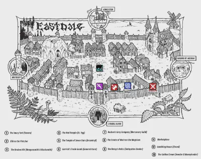 A medium-sized town surrounded by threats and run by St Ygg. There are many oppressive laws, including forbidding strong drink save during the dinner hour and banning fluorescent mushrooms in the marketplace.